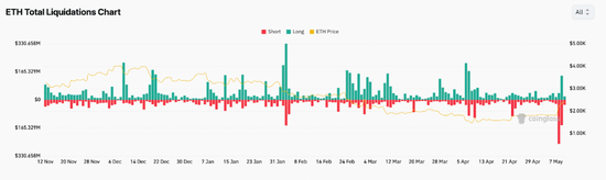 数据显示,自5月8日起,以太坊期货市场的空头头寸出现大规模平仓,清算金额高达4.3794亿美元,远超同期多头清算金额2.1129亿美元。