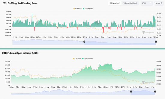 与此同时,以太坊未平仓合约总价值从5月8日的212.8亿美元激增至5月10日的267.7亿美元,以太坊永续期货的每周融资利率也从0.10%上升至0.15%。