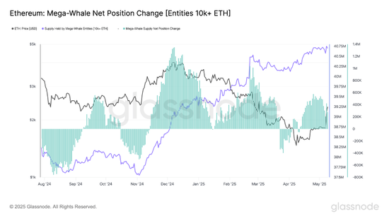 据Glassnode数据显示,自4月下旬起,这些巨鲸地址的ETH净头寸便转为正值,并持续稳步增加其持仓量。