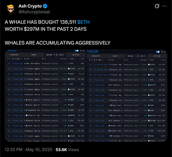 宏观层面,5月8日宣布的美英新贸易协定以及随后启动的中美贸易会谈,显著提振了市场风险偏好,也为包括以太坊在内的加密资产市场营造了积极的氛围。