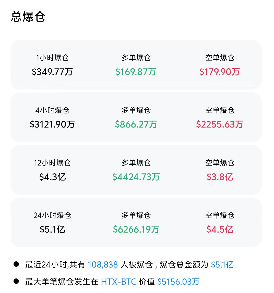 Coinglass显示,截至8时23分,最近24小时,共有10.88万人被爆仓,爆仓总金额为5.1亿美元。
