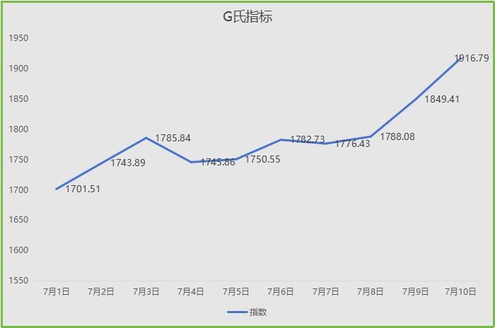 看咱们得G氏指标,现在的数据还少,它是最能反映市场动态情况的指标,记住现在记录的是7月10号 凌晨12点的收盘价,已经来到1916点,在2000点以上山寨币必然是史无前例的大牛市,看这个指标,你比看BTC 和ETH都管用,因为它代表的是市值前100币种的加权组合,更能反映当下山寨走势的情况。