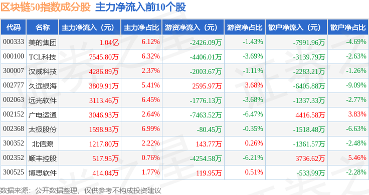 资金流向方面,区块链50(399286)指数成份股当日主力资金净流出合计47.59亿元,游资资金净流入合计10.04亿元,散户资金净流入合计37.56亿元。成份股资金流向详情见下表: