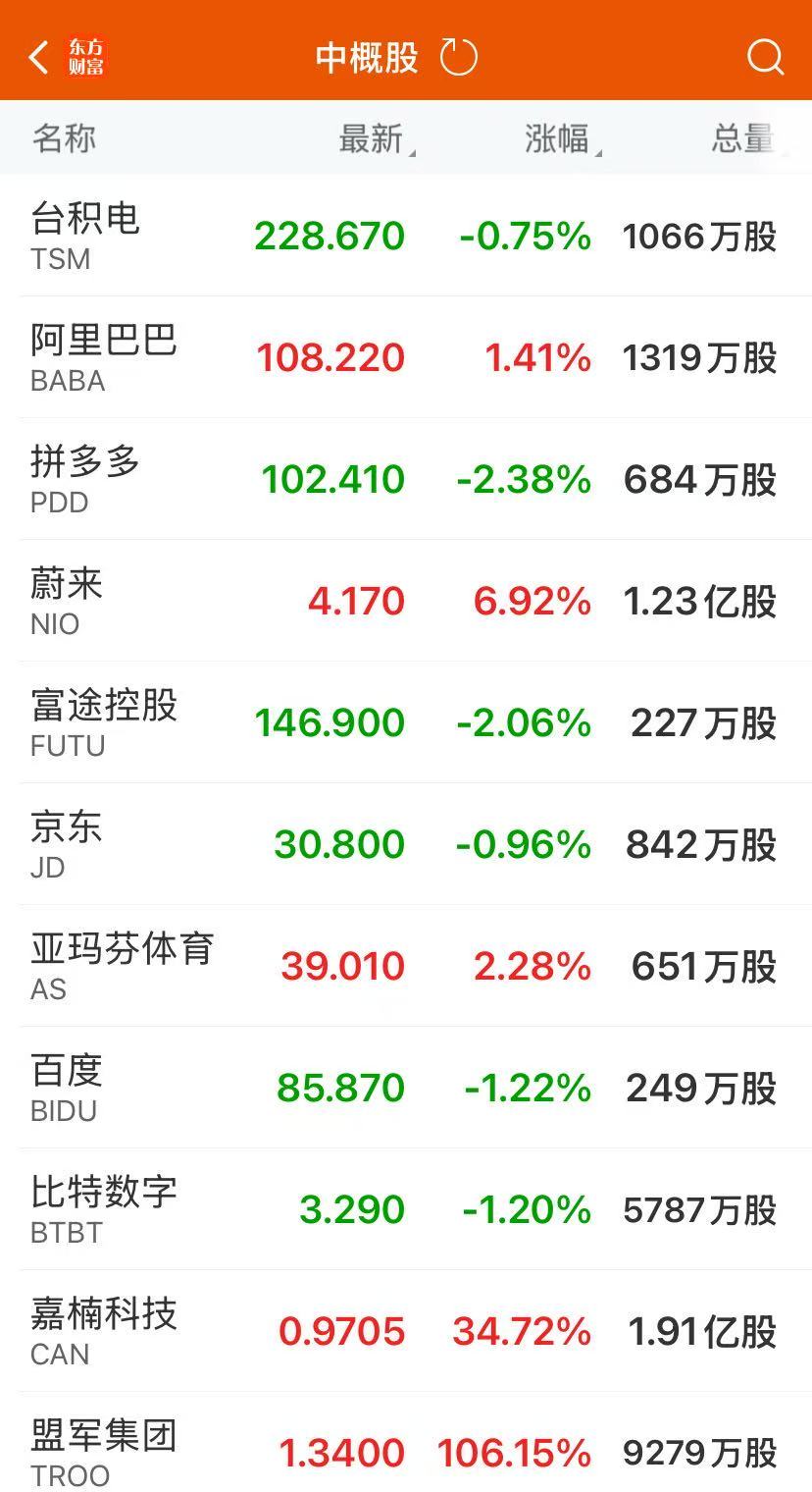 中概股多数上涨,纳斯达克中国金龙指数收涨0.73%。蔚来涨超7%,腾讯音乐、哔哩哔哩涨超4%,阿里巴巴、小鹏汽车涨超1%,百度跌超1%,拼多多跌超2%。