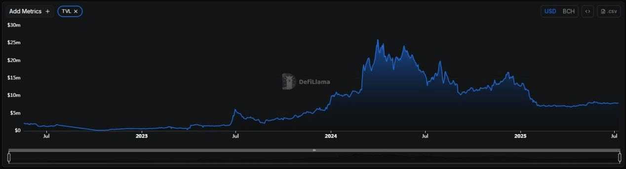 BCH的生态建设确实也吸引了资金流入。这一点从2024年开始BCH的TVL(总锁仓价值)的快速膨胀可以看得出来。总锁仓价值指的是DeFi协议中锁定的加密资产价值,反映的是资金在借贷、流动性挖矿、DEX交易、稳定币质押等活动中的活跃程度。根据数据显示,BCH的TVL从2023年低点的100万美元最高上涨到了2024年4月的超过2,500万美元,目前回落到了800万美元的水平稳步上升中。