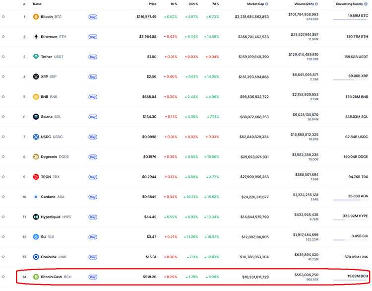 这一点从加密货币的市值排名上也可以得以一窥。根据权威加密货币讯息网站CryptoMarketCap的资料,截止2025年7月,BCH的市值规模虽然恢复到了100亿美元以上,但已落后于新兴的Solana以及TRON等加密货币,在一众加密货币的市值规模排名中已经滑落到了第14位。要知道像是Solana晚于2020年才上市,但凭借其「平台型」区块链的定位和繁荣的生态发展,开发者社区非常活跃,当下的市值规模已经冲进前十名。