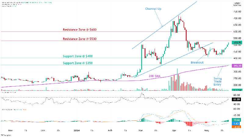 BCH如果能于此次上涨过程中有效突破530美元的阻力位,则下一个阻力价格水平将在600美元左右。而如果上涨突破失败,则下方的第一道支撑价位在400美元上下,一旦跌破则可能下探350美元。
