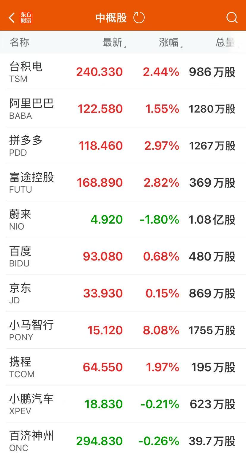 热门中概股大多上涨,纳斯达克金龙中国指数收涨0.75%。小马智行初步收涨7.7%,文远知行涨5.2%,腾讯涨4%,拼多多涨3%,台积电涨2.3%,阿里涨1.5%,网易、百度、京东涨幅不到1%,小米则跌0.7%,理想跌1.4%,蔚来跌2.1%。