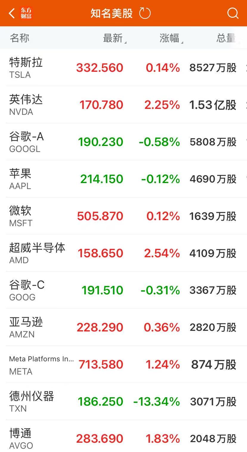 大型科技股多数上涨,英伟达涨2.25%,Meta涨1.24%,亚马逊、特斯拉、微软至多涨0.36%,苹果跌0.12%,谷歌A跌0.58%。
