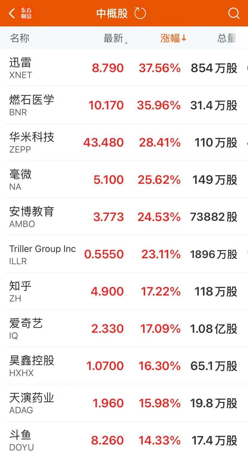 热门中概股多数上涨,纳斯达克中国金龙指数涨0.12%。热门个股方面,迅雷涨超37%,知乎、爱奇艺涨超17%,斗鱼涨超14%,金山云涨超5%,名创优品涨超4%,微博涨超3%,哔哩哔哩涨超2%;小牛电动跌超9%,好未来跌超3%。