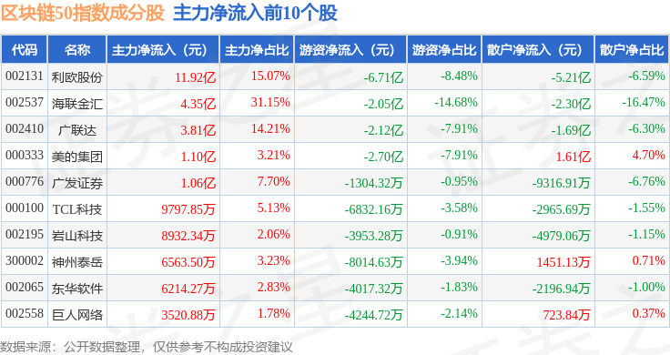 资金流向方面,区块链50(399286)指数成份股当日主力资金净流出合计9.95亿元,游资资金净流出合计10.52亿元,散户资金净流入合计20.47亿元。成份股资金流向详情见下表: